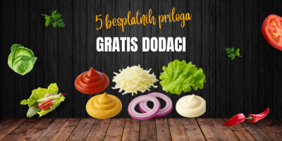 Besplatni prilozi po obroku, maksimalno 5: crni luk, tucana ljuta paprika, urnebes, pavlaka, pavlaka sa susamom, pečurke u pavlaci, kečap, senf, majonez, feferoni, burger sos, tartar sos, taciki sos, kupus, zelena salata, paradajz, krastavac, ljutenica.
