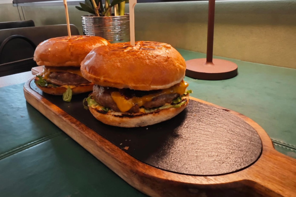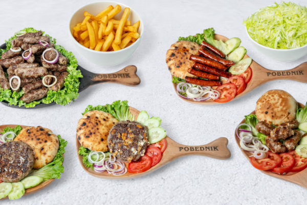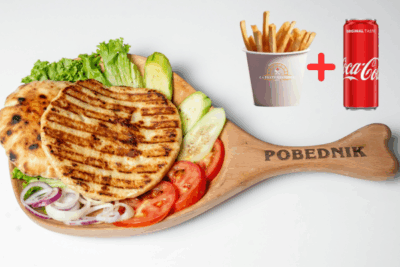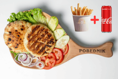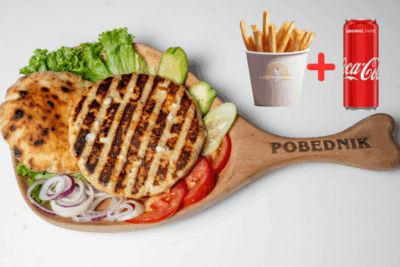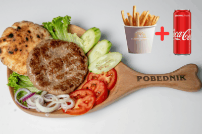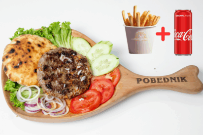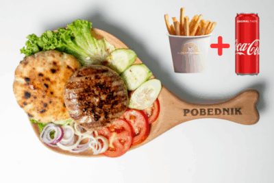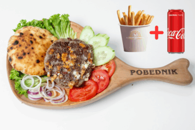 (juneće roštilj meso 120g, pomfrit 200g, kajzerica, čedar sir, burger sos hainz, kiseli krastavac, kečap, mix zelenih salata, crveni luk)