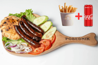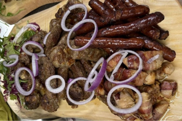 (dim. domaći svinjski vrat, dim. domaća svinjska pečenica, sprža, urnebes, domaći beli kravlji sir, sjenički sir, kozji sir, kajmak, masline, čeri)