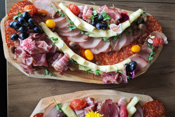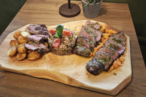(dim. domaći svinjski vrat, dim. domaća svinjska pečenica, sprža, kulen, urnebes, domaći beli kravlji sir, sjenički sir, kozji sir, kajmak, masline, čeri)