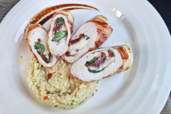 (ćureći file, pančeta, sušeni paradajz, dim. sir, bosiljak svež, pirinač, pesto roso sos)