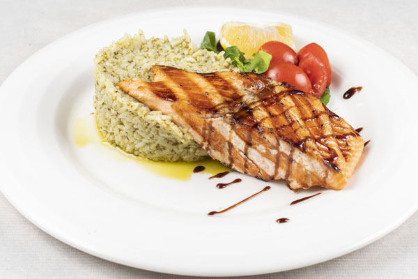 (file lososa, pirinač, pesto sos, svež bosiljak)