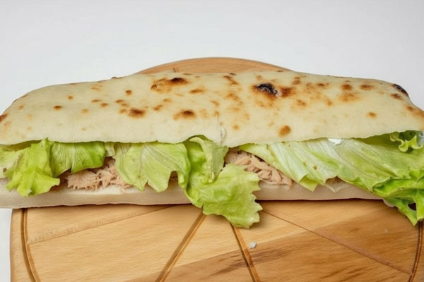 (rio mare tuna, biljni kačkavalj, pelat, ljubičasti luk, mix zelenih salata, panini)