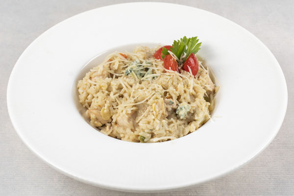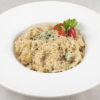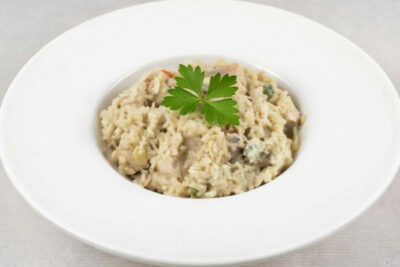 (pirinač, ćureći file, crni luk, beli luk, belo vino, bujon, gorgonzola, paprika, mladi luk, listići badema, parmezan)