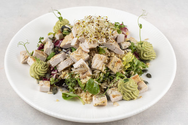 (mix zelenih salata, ćureći file, bob, šargarepa baby, pirinač, bulgur kinoa, maslinovo ulje, avokado, semenke bundeve, klice)