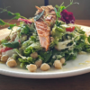 (mix zelenih salata, kus kus, čeri, losos filet, sveži krastavac, celer koren, leblebija, listići badema, limeta umak)